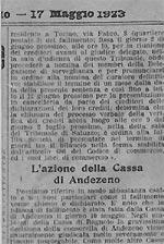 l' istanza di fallimento è stata fatta dalla Cassa di Andezeno il giorno 10 maggio. Negli ambienti della Cassa di Bagnolo la gravissima decisione della consorella di Andezeno viene naturalmente giudicata molto severamente e rimane inspiegabile. Come molte altre Casse rurali della nostra regione, anche quella